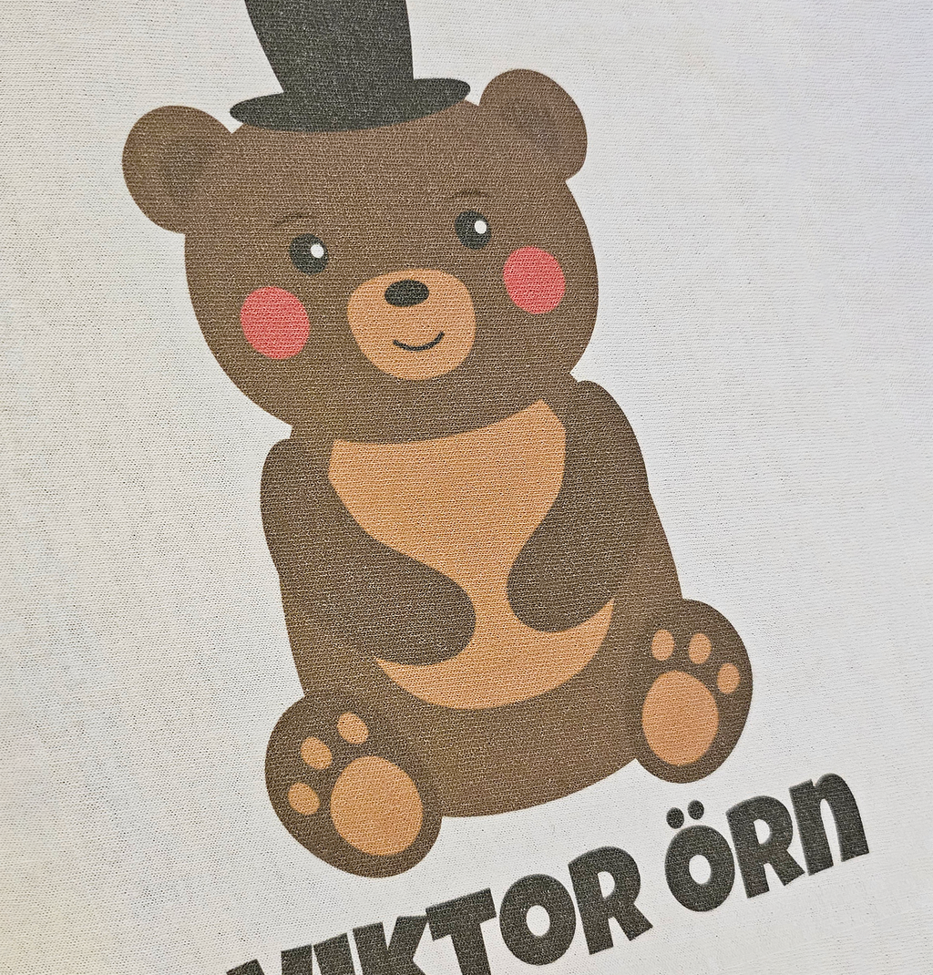 Hvítur bolur með mynd bangsa með topphatt og nafni barnsins