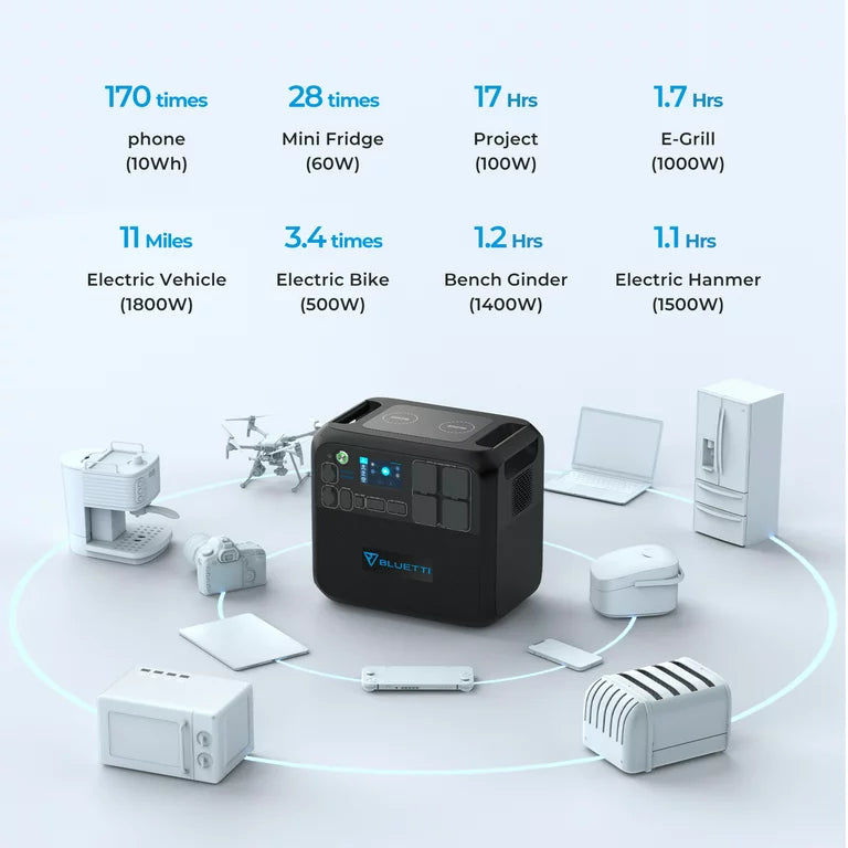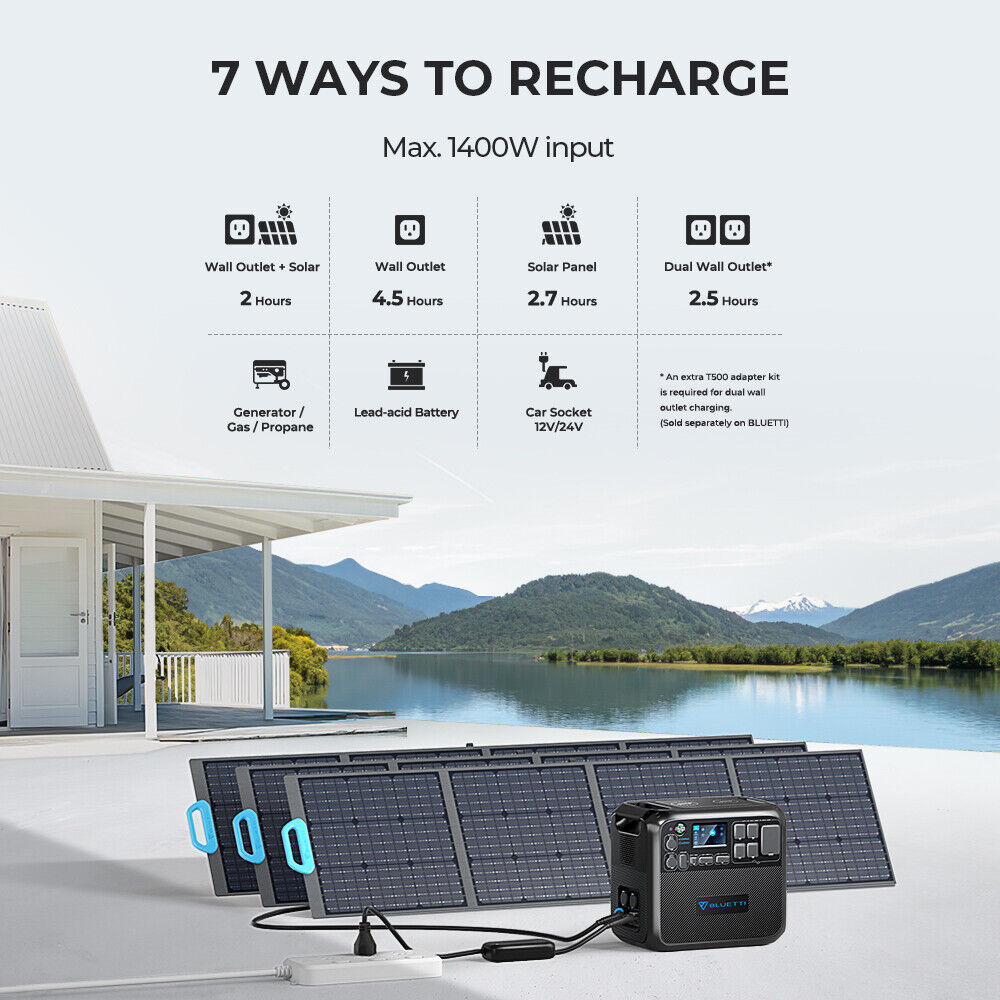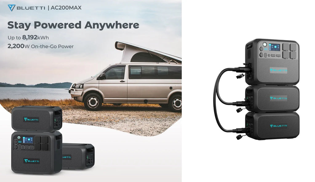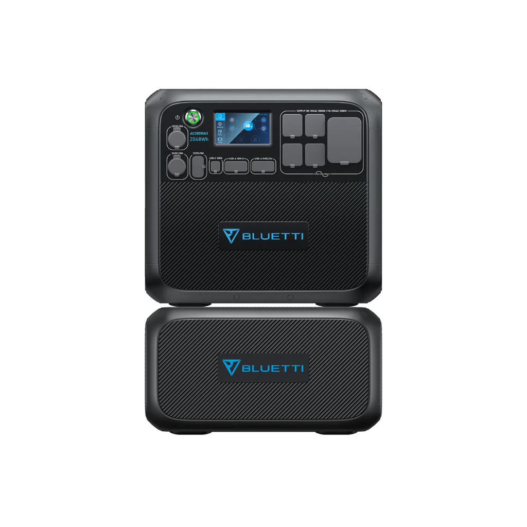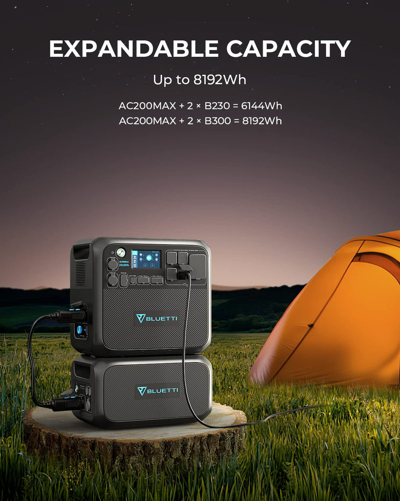 AC200MAX ferarafstin leyfir allt a 900W af slarhleslu. Hgt er a full hlaa me slarhleslu innan vi tveimur tmum vi bestu astur. Hgt er a hlaa me slarorku og 220 volta rafmagni sama tma. Hgt er a hlaa r hefbundnum tengjum blum Ennfremur, hefur BLUETTI sitt eigi inntakstengi fyrir 2000W vibtarorku fr B230 orkubanka. Hgt er a bta tveimur B230 vi og annig hafa 6000W orku heildina. Bluetti AC200MAX FERARAFST ORKUBANKI