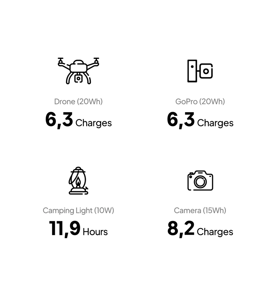 Frá vinnu til leikja, X20 sér auðveldlega um að knýja daglegu tækin þín. Hvort sem það er fyrir vinnu utan nets, útivistarljósmyndun eða leiki á ferðinni, þarftu aldrei aftur að hafa áhyggjur af því að verða rafmagnslaus eða finna rétta tengið.