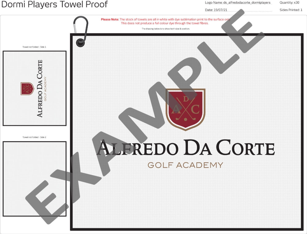 Mjög rakadrægt 350gsm míkrótrefja handklæði. Skær litaframsetning og nákvæm myndprentun gefa DORMi Players handklæðinu stærra og áhrifameira prentsvæði fyrir lógóið þitt en hefðbundin útsaumstaðsetning.