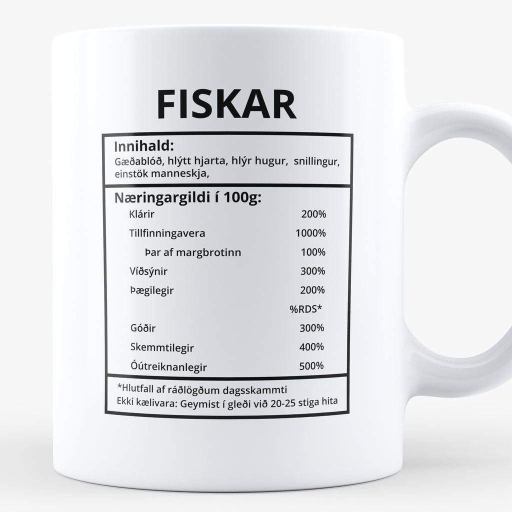 Prentað á báðar hliðar.  Stjörnumerki framaná bolla, innihaldslýsing aftaná.
