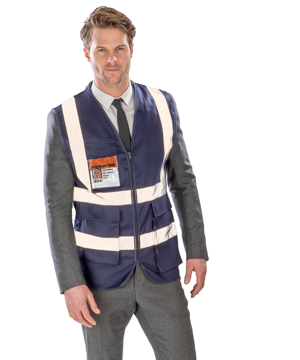 Easy-to-decorate security vest in durable polycotton with extra-length pocket suitable for housing testing equipment. Yellow and Orange: UK 2019 S1696 Schedule 35 Regulation 38 UKCA RIS-3279-TOM Issue 2 2019 (Orange only). Black & Navy: EN17353:2020 Type B3 (Enhanced visibility for night use only).