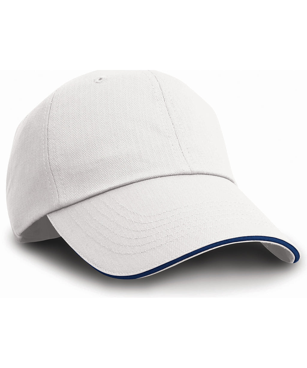 Herringbone weave. 6 panel. Low profile. Unsupported front panels. Pre-curved peak with 6 stitch lines. Contrasting colour sandwich peak. Stitched eyelets. Fabric size adjuster with antique brass buckle.Decoration Guidelines:Decorating methods: Embroidery & Transfer print Decorators access point: Open.