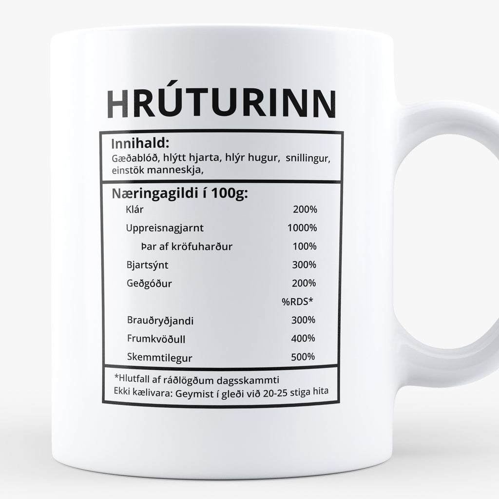 Prentað á báðar hliðar.  Stjörnumerki framaná bolla, innihaldslýsing aftaná.