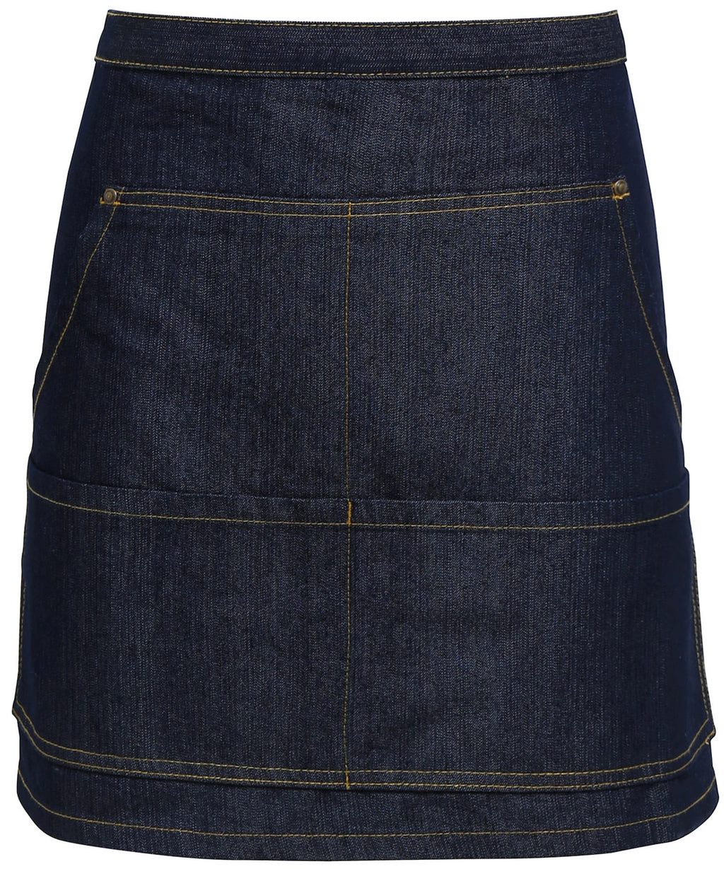 We have combined practicality with style and are proud to present this trendy denim waist apron that is a welcome addition to the hospitality wear collection. A popular cropped style featuring contrast stitch detail that forms four front pockets which are handy for carrying payment terminals and order pads. Self-fabric ties are long enough to be doubled and tied at the front completing a neat and professional uniform for service staff.
