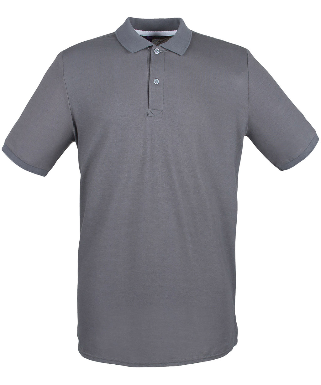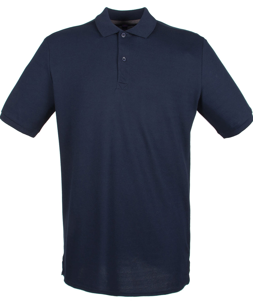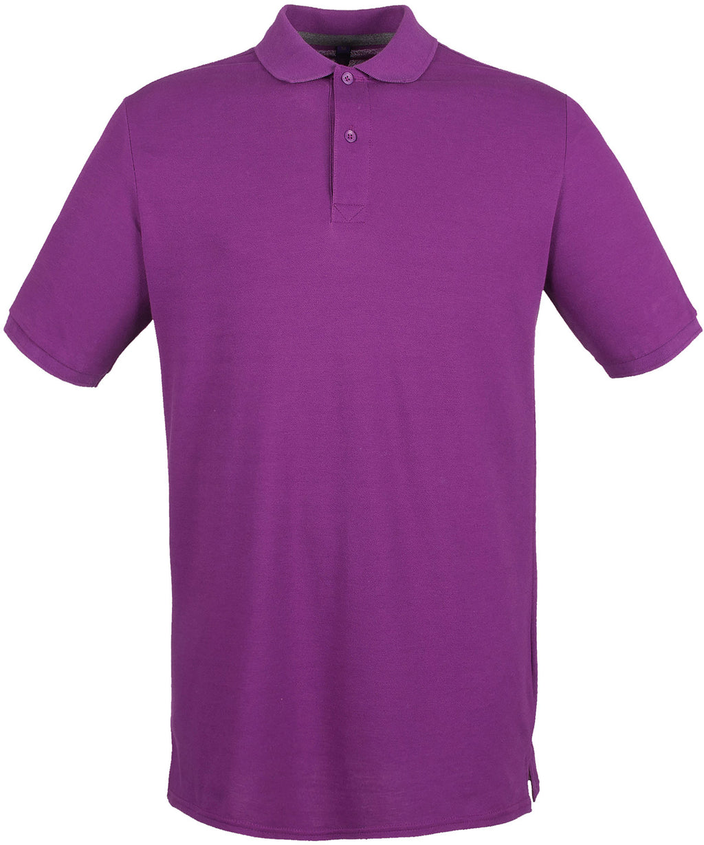 Modern-fit in a lightweight micro-fine piqué with a short point collar, fitted sleeve and cuffs for a modern and fresh new look. Micro-fine piqué is ideal for printing. 2 Button placket, Dyed to match buttons. Contrast herringbone tape in back neck and side vents. Henbury Cut-out back neck brand label. WRAP certified.