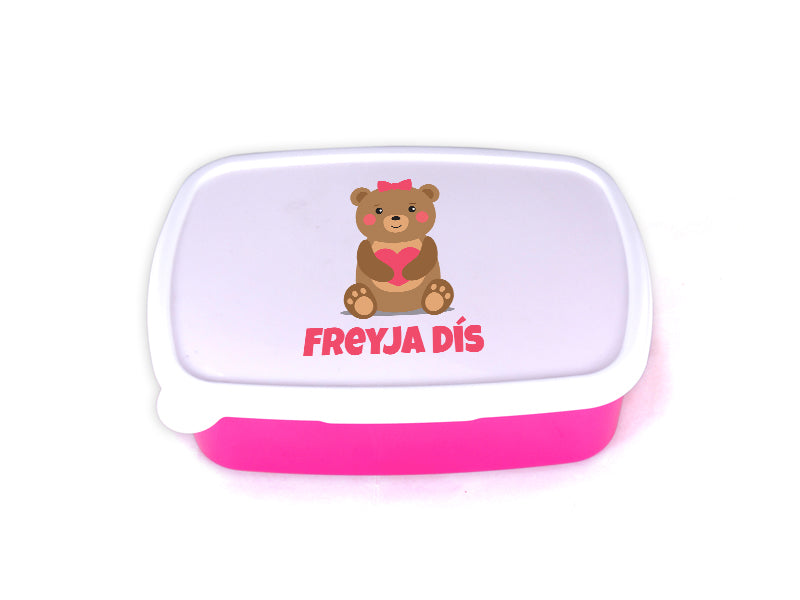 Nestisbox bleikt með hjarta bangsa og nafni barnsins