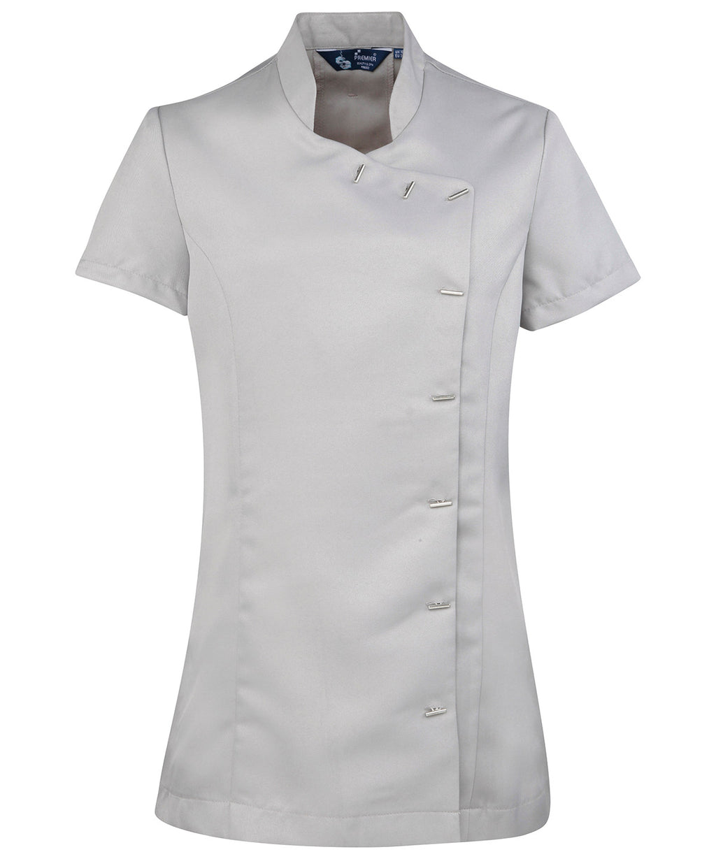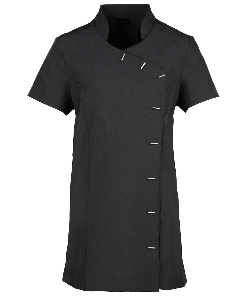 Beauty and spa tunic with mandarin collar. Asymmetric button fastening to the front with eight bar shaped buttons. Short sleeve. Side vents. Back pleat for ease of movement. Princess seams. Easycare. BSCI certified. Reach certified.