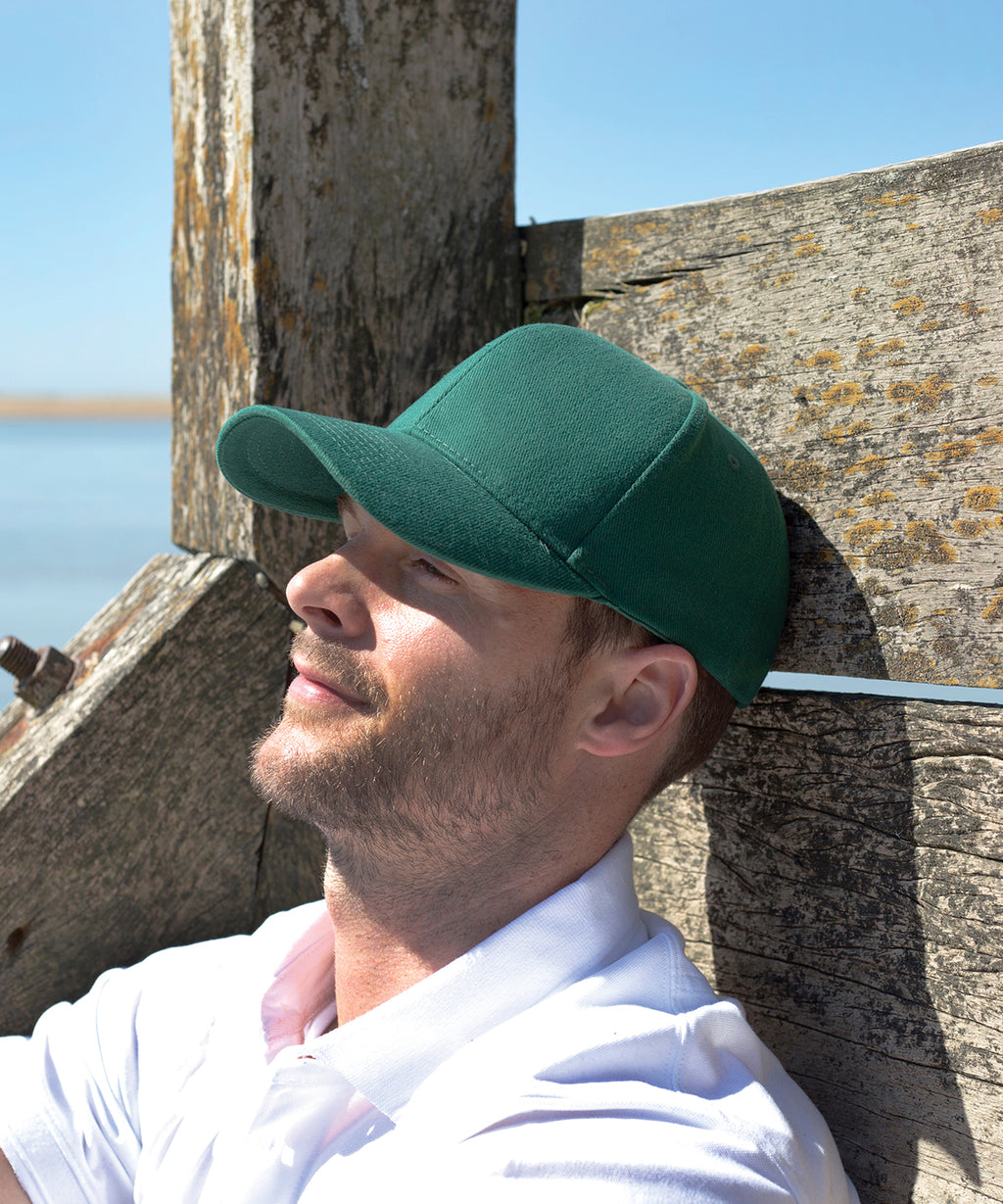 6 panel. Full profile. Laminated cotton support backing to front panels. Pre-curved peak with 8 stitch lines. Stitched eyelets. Fabric size adjuster with antique brass buckle.Decoration Guidelines:Decorating methods: Embroidery. Decorators access point: Open.