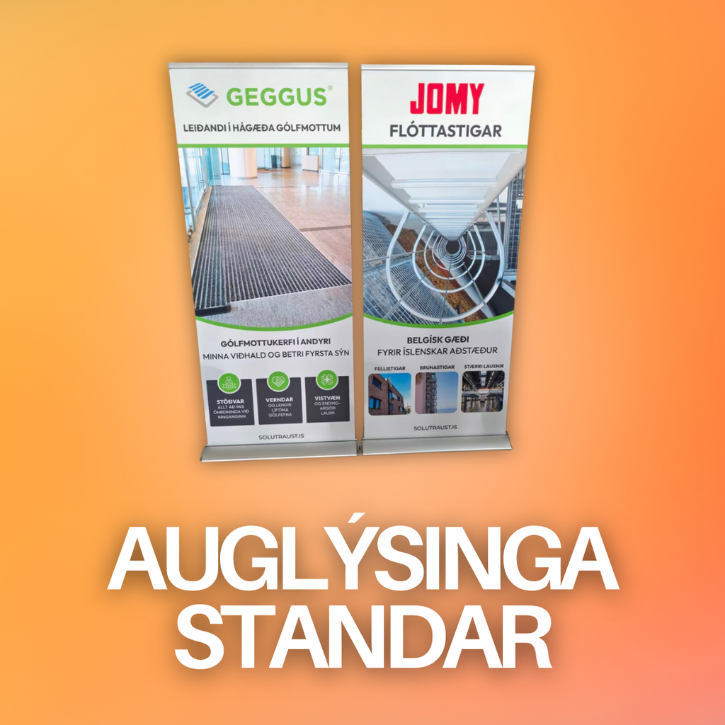Við framleiðum Roll-Up standara með sérprenti sem henta einstaklega vel fyrir sýningar, ráðstefnur, verslanir, móttökur, námskeið og hvers kyns viðburði þar sem þú vilt koma skilaboðum á framfæri á skýran, snyrtilegan og áberandi hátt.
