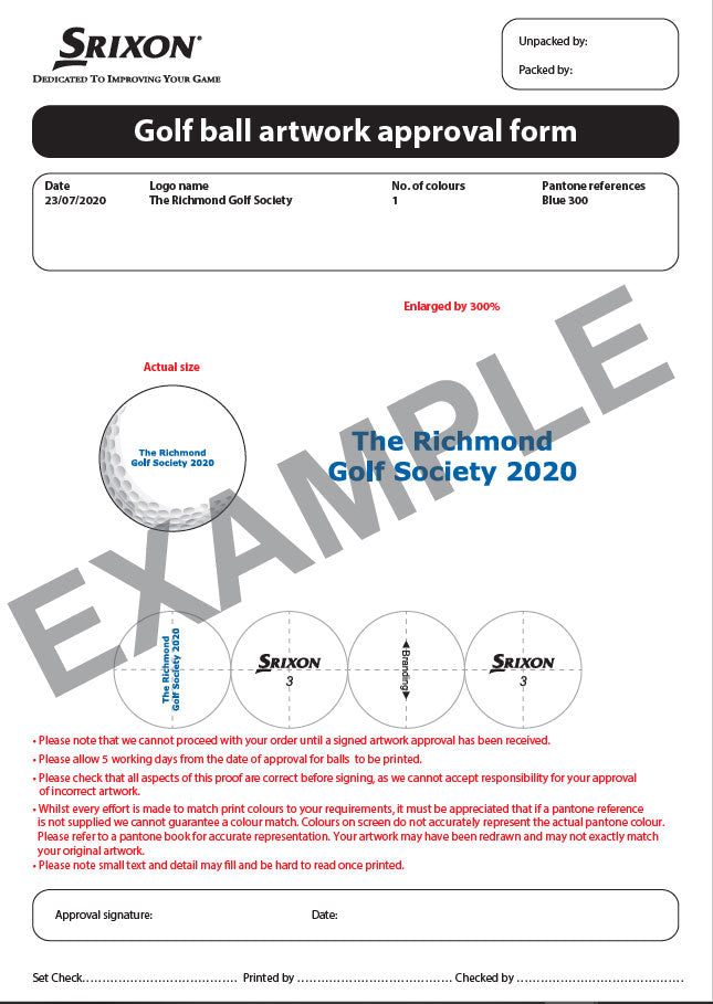 Lágmarkspöntun fyrir textaprentun á Srixon golfboltum er 3 tugir. Verðið felur í sér möguleika á PDF útlitsprufu sem sýnir valinn texta áður en framleiðsla hefst.