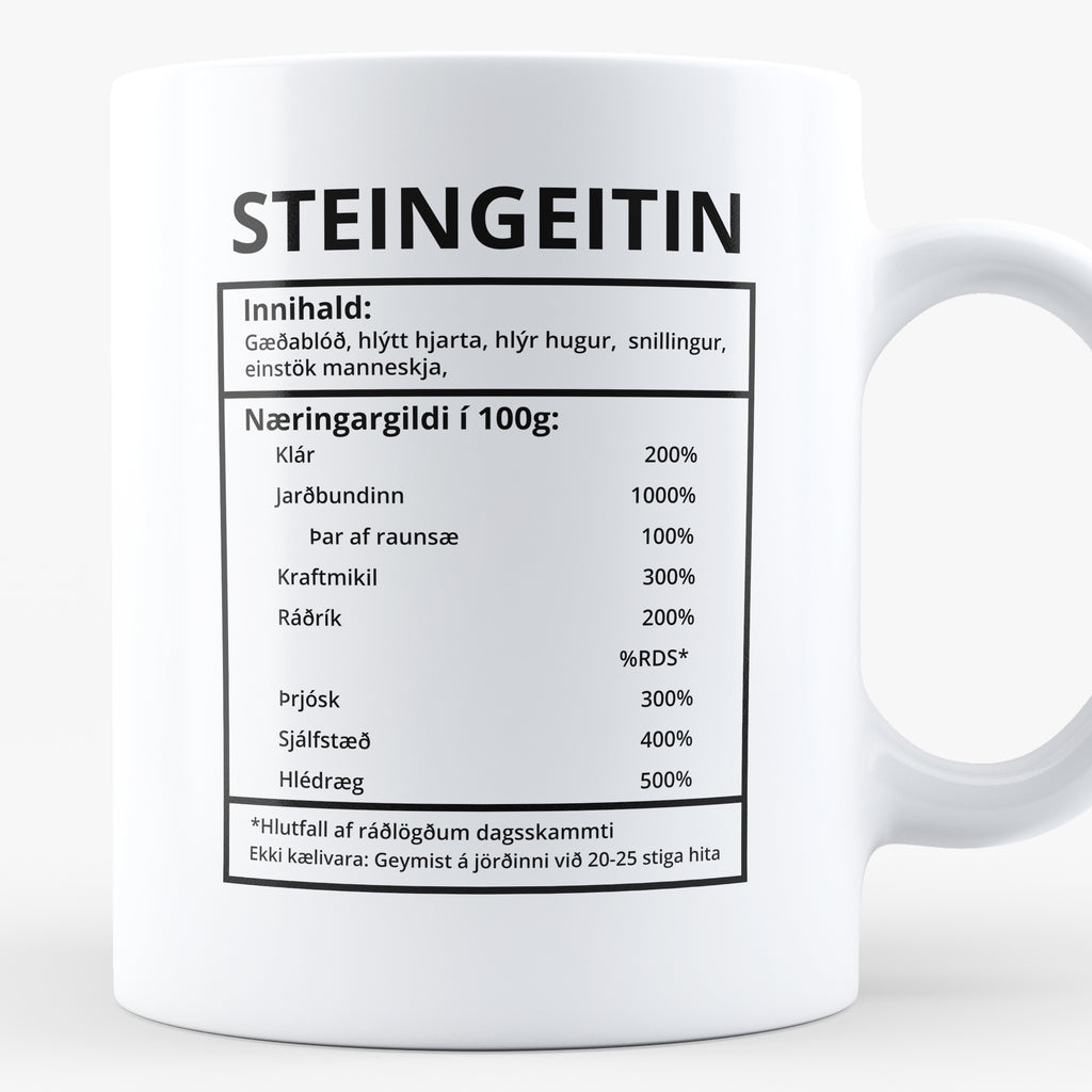 Prentað á báðar hliðar.  Stjörnumerki framaná bolla, innihaldslýsing aftaná.