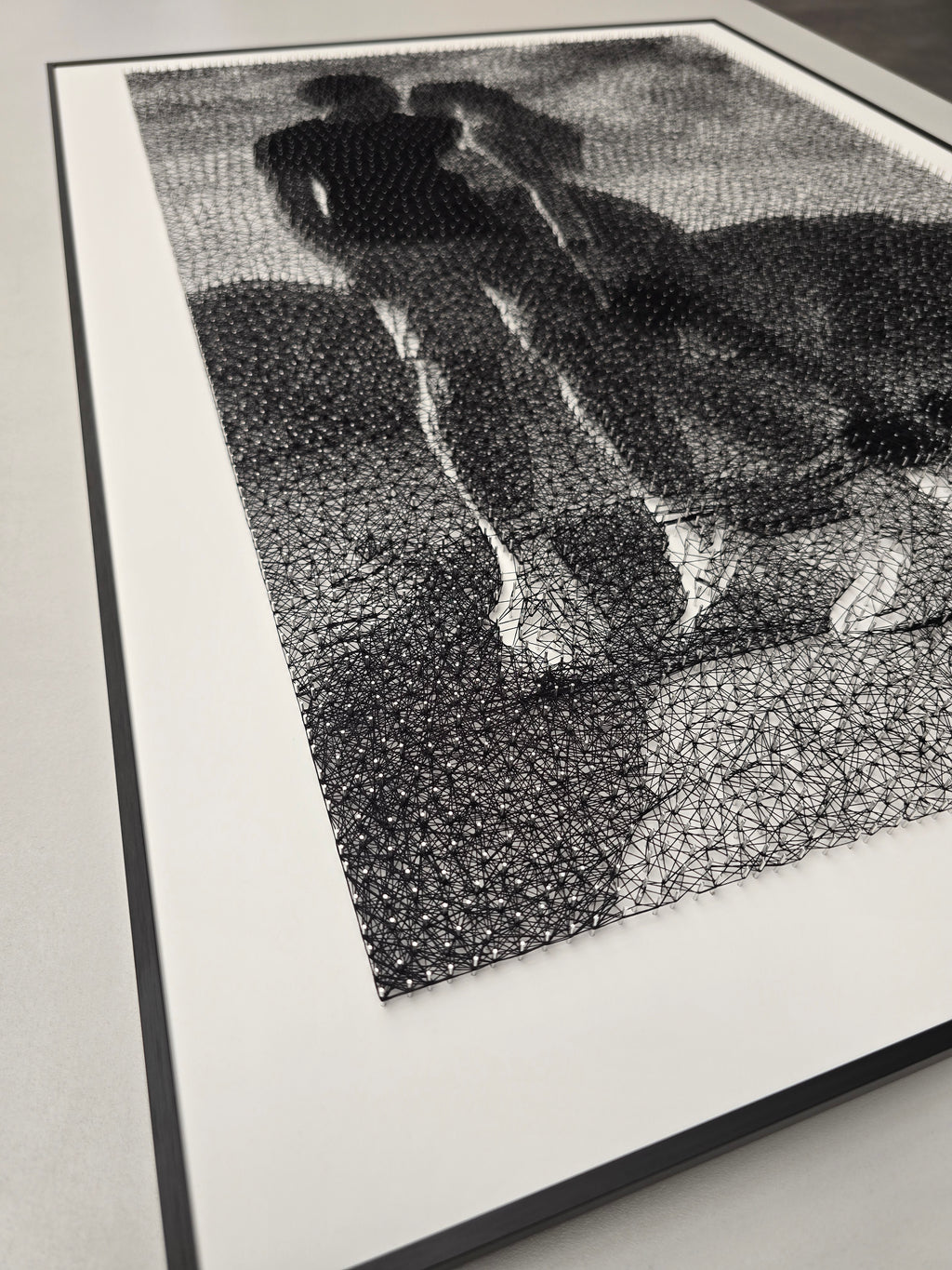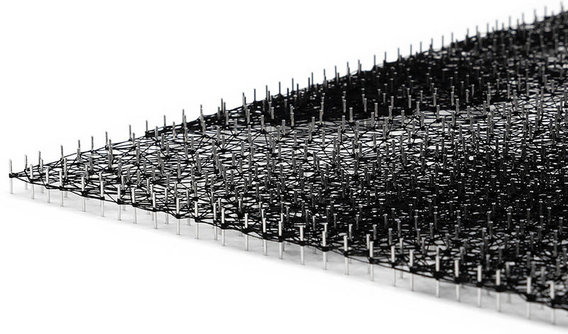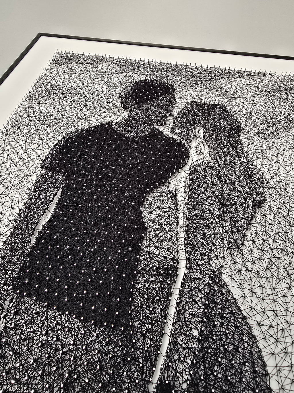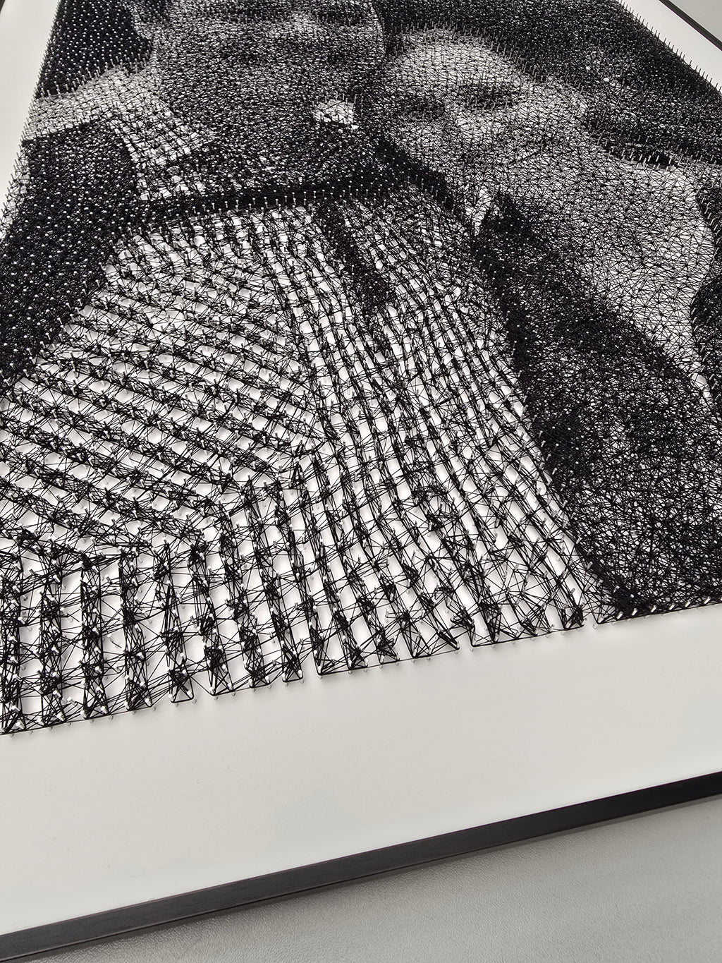- Myndirnar gerðar í sérsmíðaðri vél þar sem 3.000-12.000 naglar eru negldir og allt að 2 metra þráður þræddur á milli þeirra til að endurskapa myndina.