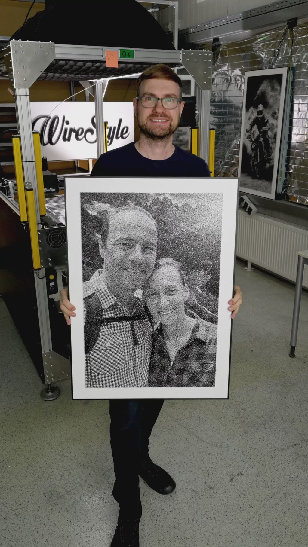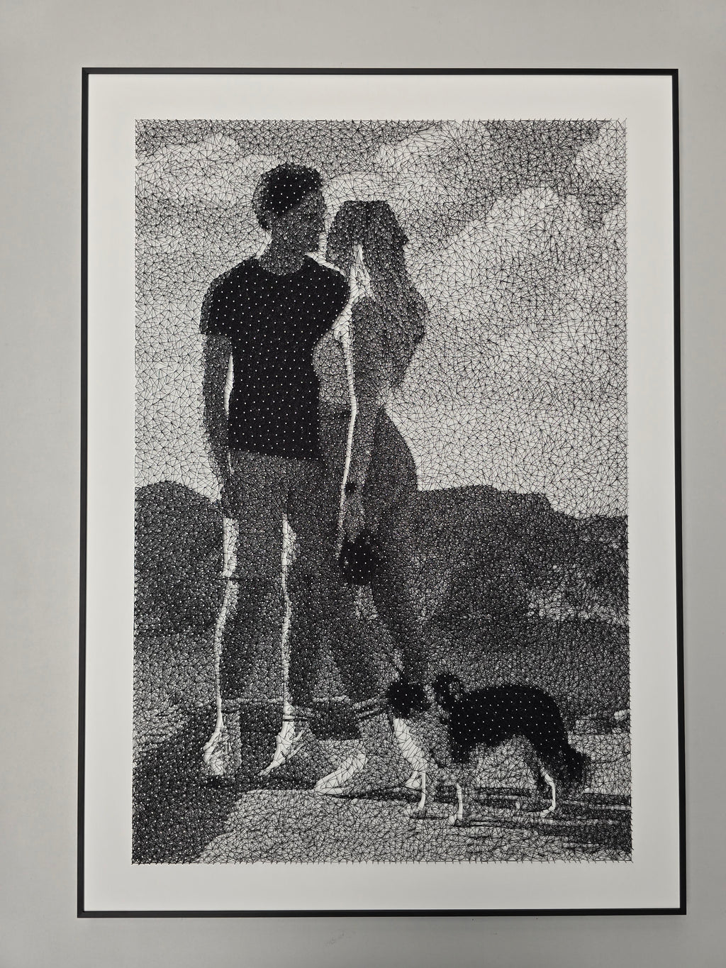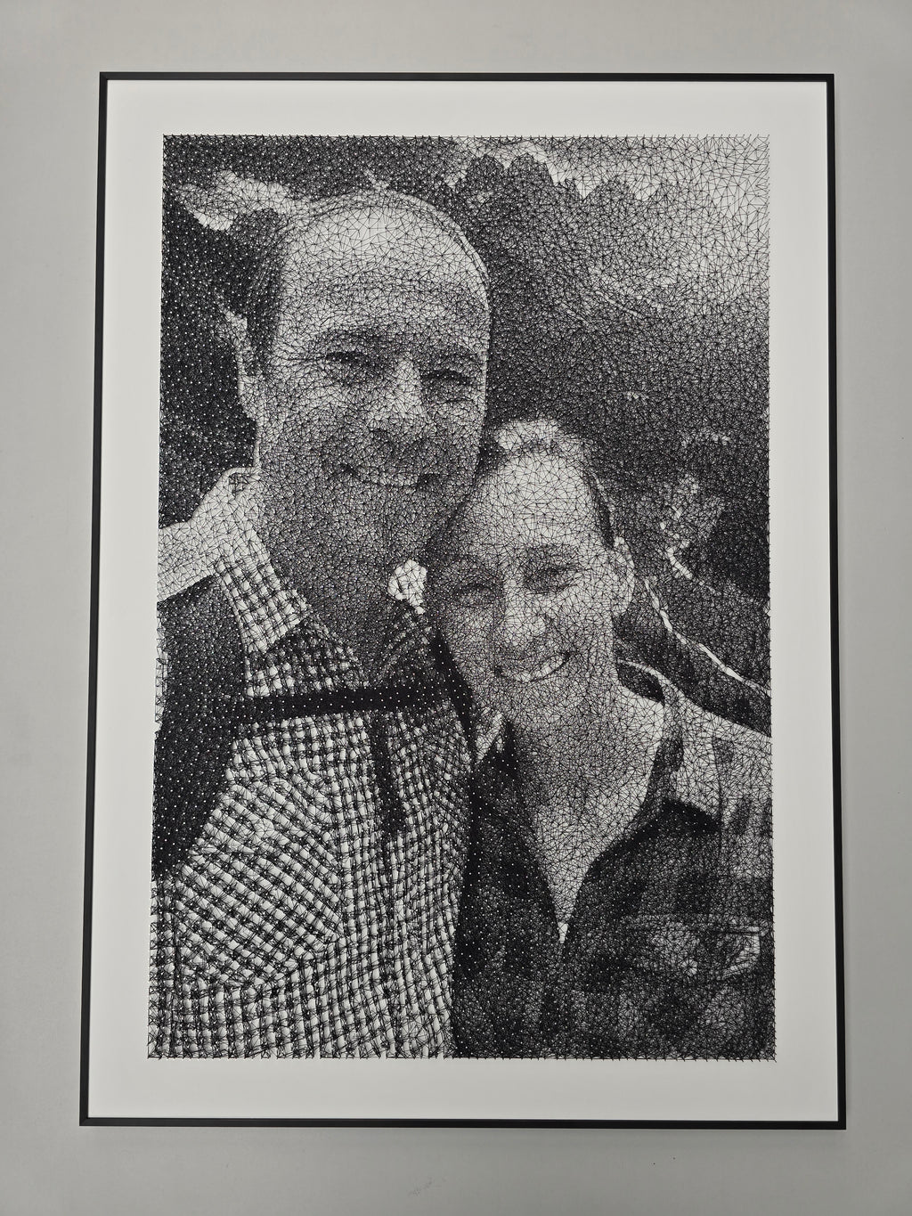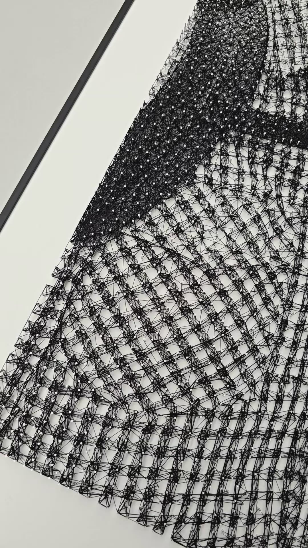 - Myndirnar gerðar í sérsmíðaðri vél þar sem 3.000-12.000 naglar eru negldir og allt að 2 metra þráður þræddur á milli þeirra til að endurskapa myndina.