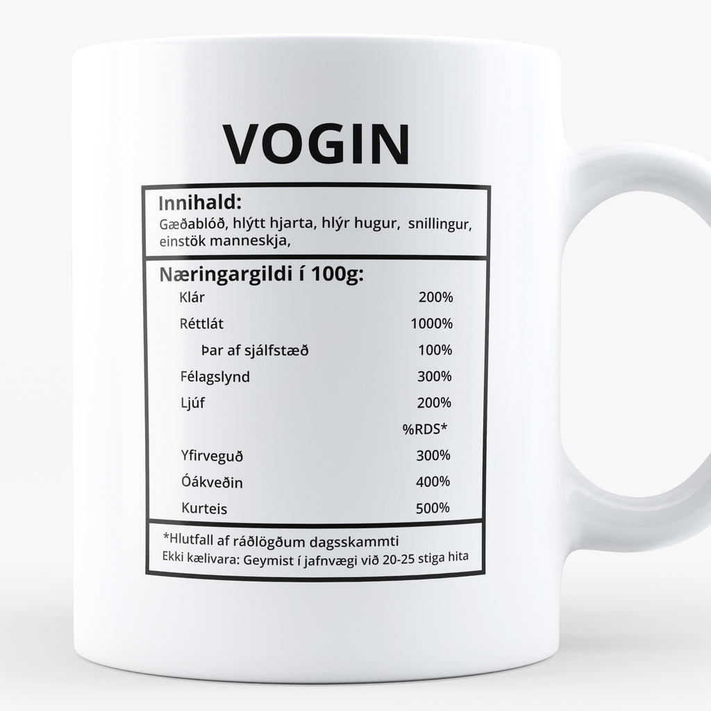 Prentað á báðar hliðar.  Stjörnumerki framaná bolla, innihaldslýsing aftaná.