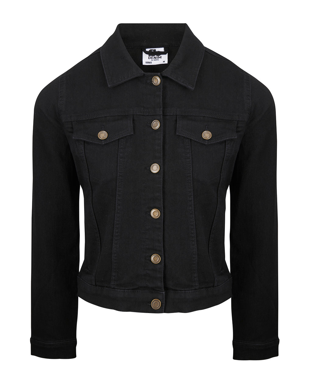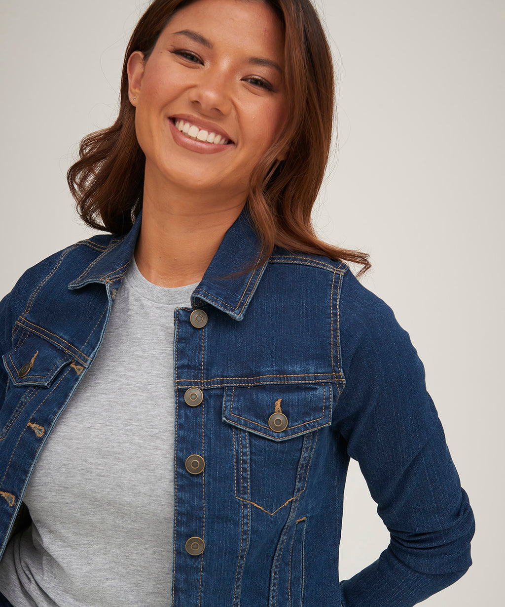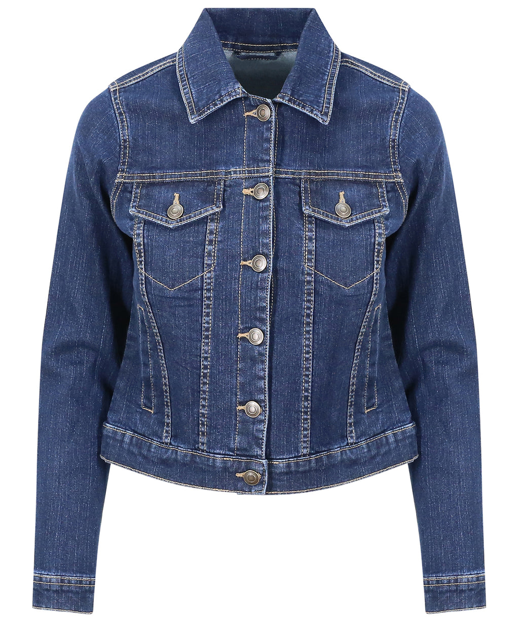 Cotton/elastane blended denim jacket with classic denim styling. 4 pocket design, shank button placket, button cuffs and adjustable back. Specific feminine fit with crop design. Contemporary female fit. Fashion fit. Stretch denim. 4 pocket styling. Classic light and dark blue washes. Contrast stitching. Classic denim jacket panelling. Button cuff detail. Inside back neck hanger loop. Vegan certified. BSCI certified. Oeko-Tex certified. SEDEX certified.