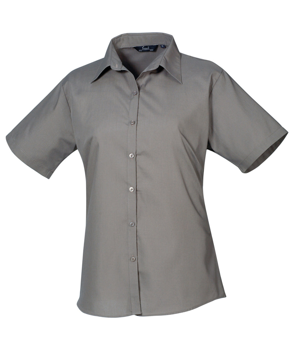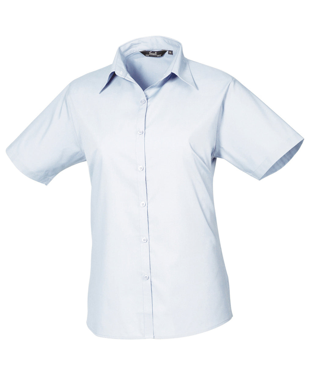 A ladies short sleeved Poplin blouse with semi fitted styling, available in 30 colours. The blouse features soft collar styling with bust and back darts and a rounded bottom hem for an attractive piece of workwear for women.